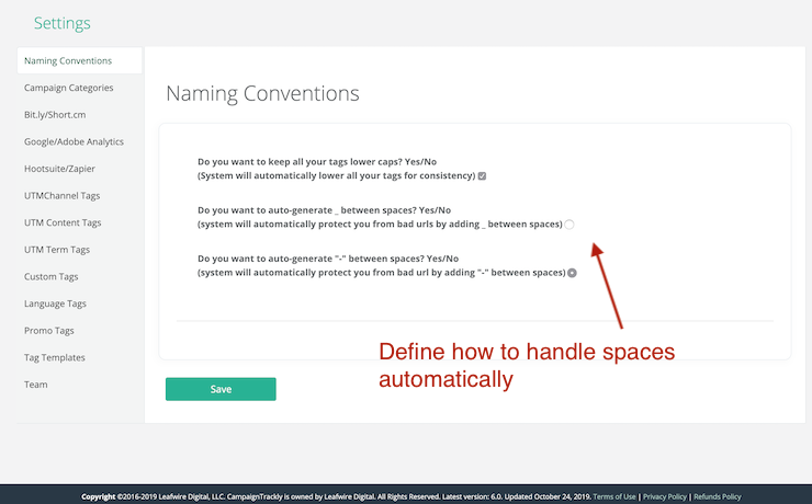 - Just go to Settings>Naming Conventions to set up how spaces between links and tags need to be generated.