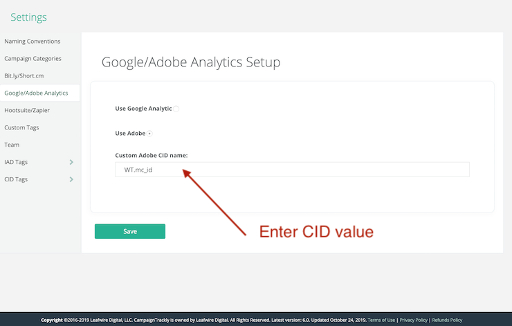 - Next enter your preferred CID value in the Google/Adobe Analytics Setup.