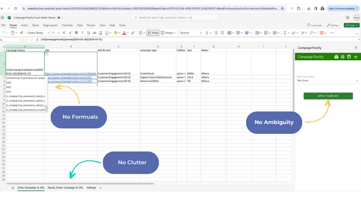Just open any Excel, add our Excel add-in with a click, type your campaign & URLs, and click to generate your UTMs. It’s THAT easy!